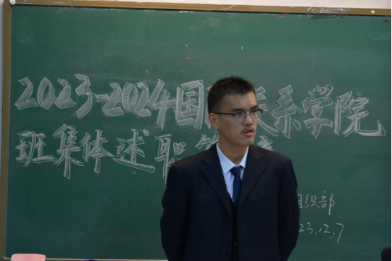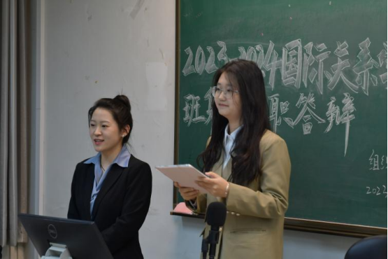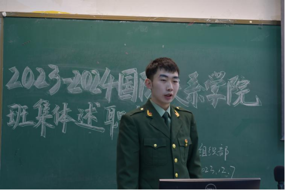 为建设优良的班风、学风,促进各班争创先进良好局面的形成,进一步增强班级的凝聚力和竞争力,根据《北京语言大学先进班集体评选办法》,国际关系学院于2023年12月7日晚19:00在教一212室,举办2023-2024学年班集体述职答辩活动。国际关系学院党总支书记王秋生、团总支书记于小萱、20级国际事务与国际关系专业团支书王骏喆担任本次答辩的评委。此次答辩活动共有来自21级和22级的4个班集体参加,各班按照顺序依次展示。