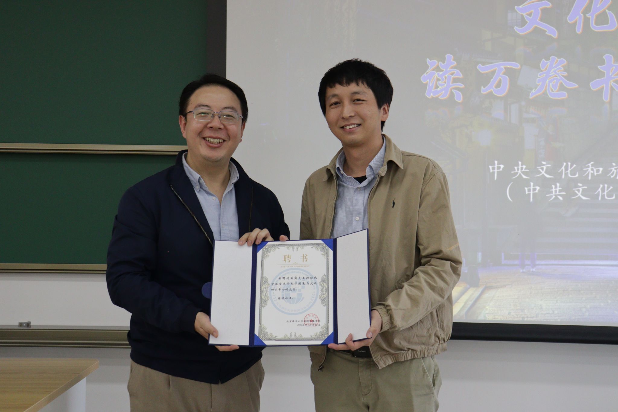 学院党总支书记杨天乔为苗宾副教授颁发北京语言大学大学形象与文化研究中心研究员聘书