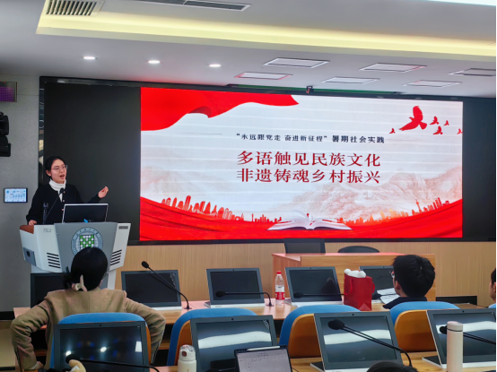 耿思贤同志与大家交流了她在社会实践领域的成就和经验。她所带领的“如果鱼皮会说话”社会实践小组,围绕“非遗”“多语种国际传播”“乡村振兴”等主题,调研赫哲族非物质文化遗产鱼皮画的传承现状。“如果鱼皮会说话”暑期实践团队荣获“2022年首都大学生社会实践优秀团队”称号,耿思贤同志本人也被授予“先进个人”称号。她指出,正确明晰的方向,各有所长的团队,提前、稳妥、细致的规划以及双线进行的路径,是她们团队取得优秀实践成果的秘诀。