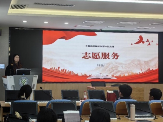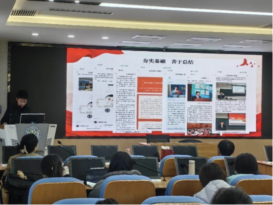 高睿璇老师总结了一年来支部开展的各类党日活动和共建项目,其中“我为师生办实事”项目以学院公众号为平台,围绕“中国热词”“青年论坛”“源远流长”“文化撷英”“世界足迹”五大板块,已经发布多篇优秀文章,提升同学们的创新思辨能力、跨文化交流能力、国际传播能力,展示英院学子扎实的专业技能、广阔的国际视野、昂扬的精神风采。而在具体学习工作的实践中,六位党员先锋代表分别从学术科研、志愿服务、社会实践、申研深造、学生工作、成长发展等方面,分享他们的经验做法,引领朋辈共同进步。