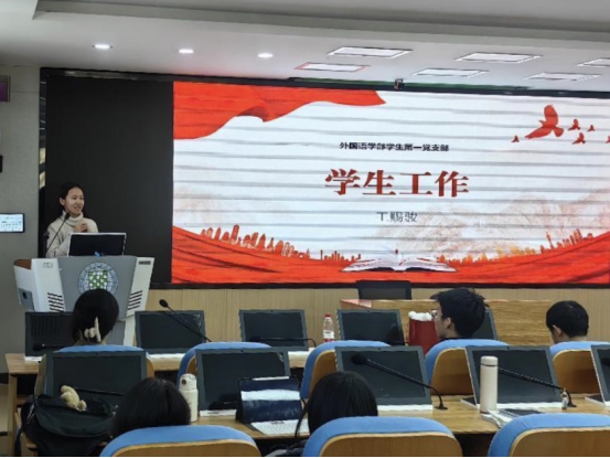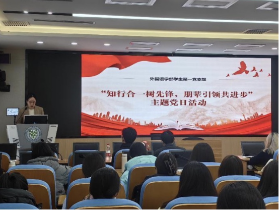 为充分发挥党员先锋的榜样模范作用,鼓励支部同学在朋辈之间引领互助,12月19日中午12:40,外国语学部学生第一党支部“知行合一树先锋 朋辈引领共进步”主题党日活动在教五311教室举行。本次活动面向外国语学部学生第一党支部全体党员和入党积极分子。学校办公室主任李志坚老师、外国语学部学生第一党支部书记高睿璇老师、副书记王振泽老师出席了本次主题党日活动。