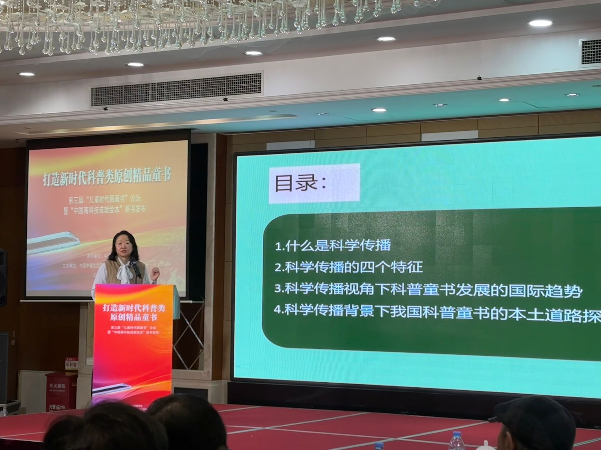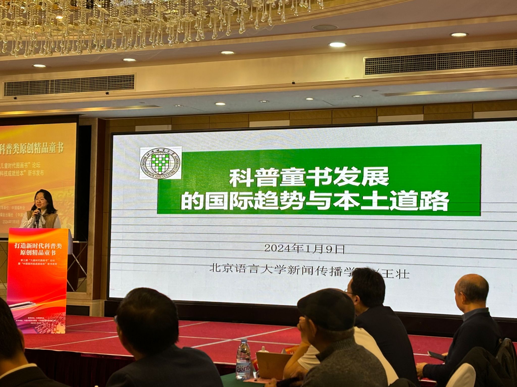 北京语言大学新闻传播学院王壮教授应邀出席会议并以“科普图书出版的国际趋势与本土道路”为主题发表主旨演讲。王壮教授从国际传播视角出发,总结了科学传播具有双向互动性、受众能动性、培养科学人文素养、走向复合知识认知的四个特征;分析总结科学传播视角下科普童书发展的国际趋势,并为我国原创科普童书如何实现国际化、数智化、精品化的高质量发展提出了可行性建议。其发言观点得到与会领导与专家们的充分肯定,也为参会的儿童科普作家、插画师、出版社编辑和媒体界同仁带来重要启发。