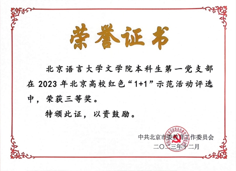 近日,北京市委教育工委公布2023年北京高校红色“1+1”示范活动评选结果。北京语言大学文学院本科生第一党支部荣获三等奖,此次获奖为该支部第二次获得该奖项。此次评选,在全市1615 个学生党支部中,共计评选出一等奖 15 个、二等奖 20 个、三等奖 60 个、优秀奖 100 个。