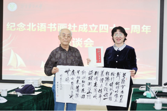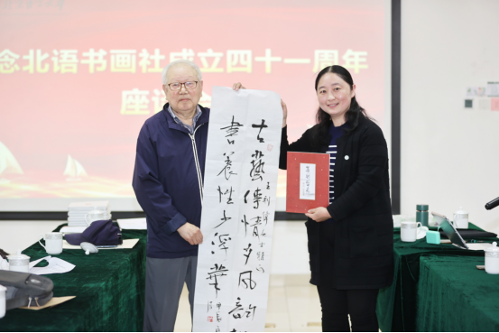 5月7日,“纪念北语书画社成立四十一周年”座谈会在北京语言大学隆重召开。学校党委副书记魏晖、学校关工委常务副主任、枫叶书画社顾问林国立、学校档案馆馆长王利伟、学校图书馆馆长邓亚文、学校工会副主席赵冠群、学校团委副书记邹泺铱、学校党委宣传部项目负责人邵宗艺、离退休工作处党委书记崔克娟、党委副书记阮晓曦出席会议。受邀的还有原北京语言学院副院长刘铁民、北语友谊书画社第一任社长邹任风的女儿邹华,以及老年大学教师金亭亭、老年大学办公室负责人陈世平、晚晴诗社社长刘杰、梧桐书画院成员曹心源、郑怀宝等。枫叶书画社主要负责人袁丹主持会议。众多嘉宾以及枫叶书画社的社员们齐聚一堂,共话书画感悟。