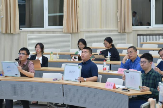 按照规定,本轮比赛由到场的六名选手进行比拼。决赛试题组由5道填空题、10道单选题和论述题构成。客观题部分,选手统一根据PPT上的题目,在白板上作答,每题限定作答时间为30秒,工作人员按铃提醒后,选手们应先放笔停止作答,在得到主持人示意后再统一亮出答案。