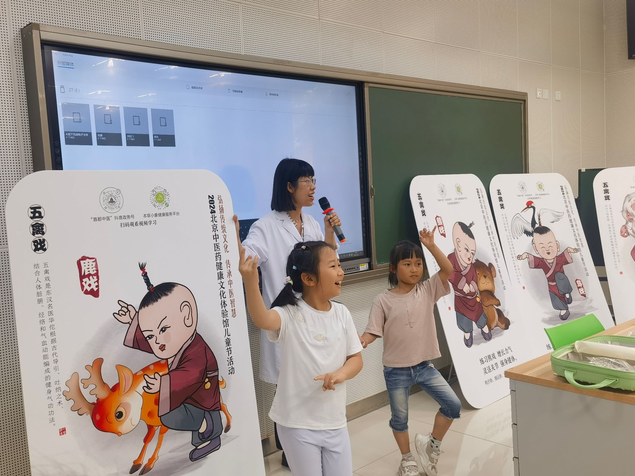 在学习中医健身功法环节,同学们分成五组,通过团队协作方式,学习和展示了中国传统健身功法——五禽戏。每组学生分别学习五禽戏中的五个动作之一(虎、鹿、熊、猿、鸟), 最后集体呈现所有动作,以快乐健康的方式,既学习了中医功法,又展现了孩子们的团队协作精神。