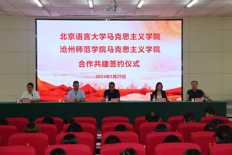 5月29日,北京语言大学马克思主义学院党总支书记丁文阁、院长杜运辉带领教师代表及毕业生代表赴河北省沧州市,同沧州师范学院马克思主义学院进行合作共建签约仪式。仪式在沧州师范学院礼堂举行,党总支书记顾大鹏主持仪式。沧州师范学院党委常委、副校长范小振同志致欢迎辞,沧州师范学院马克思主义学院院长李树旗、副院长刘云鹤及学院师生参加。
