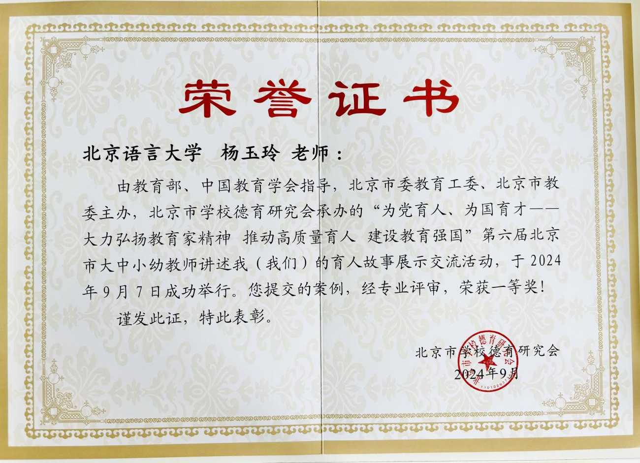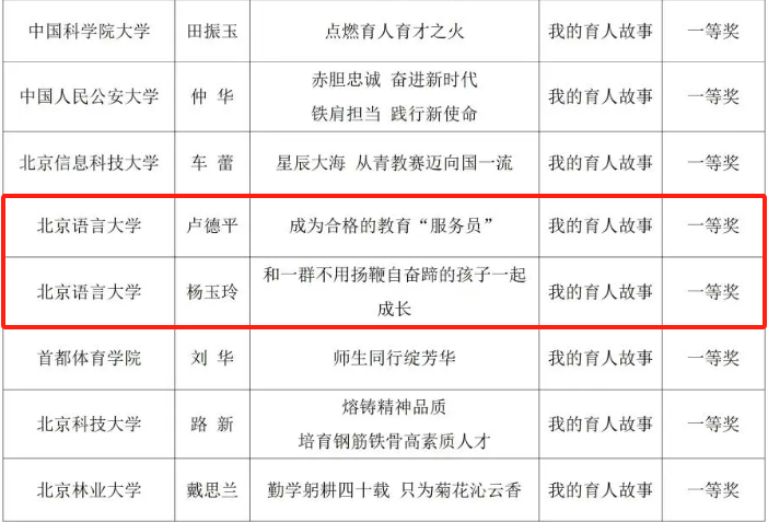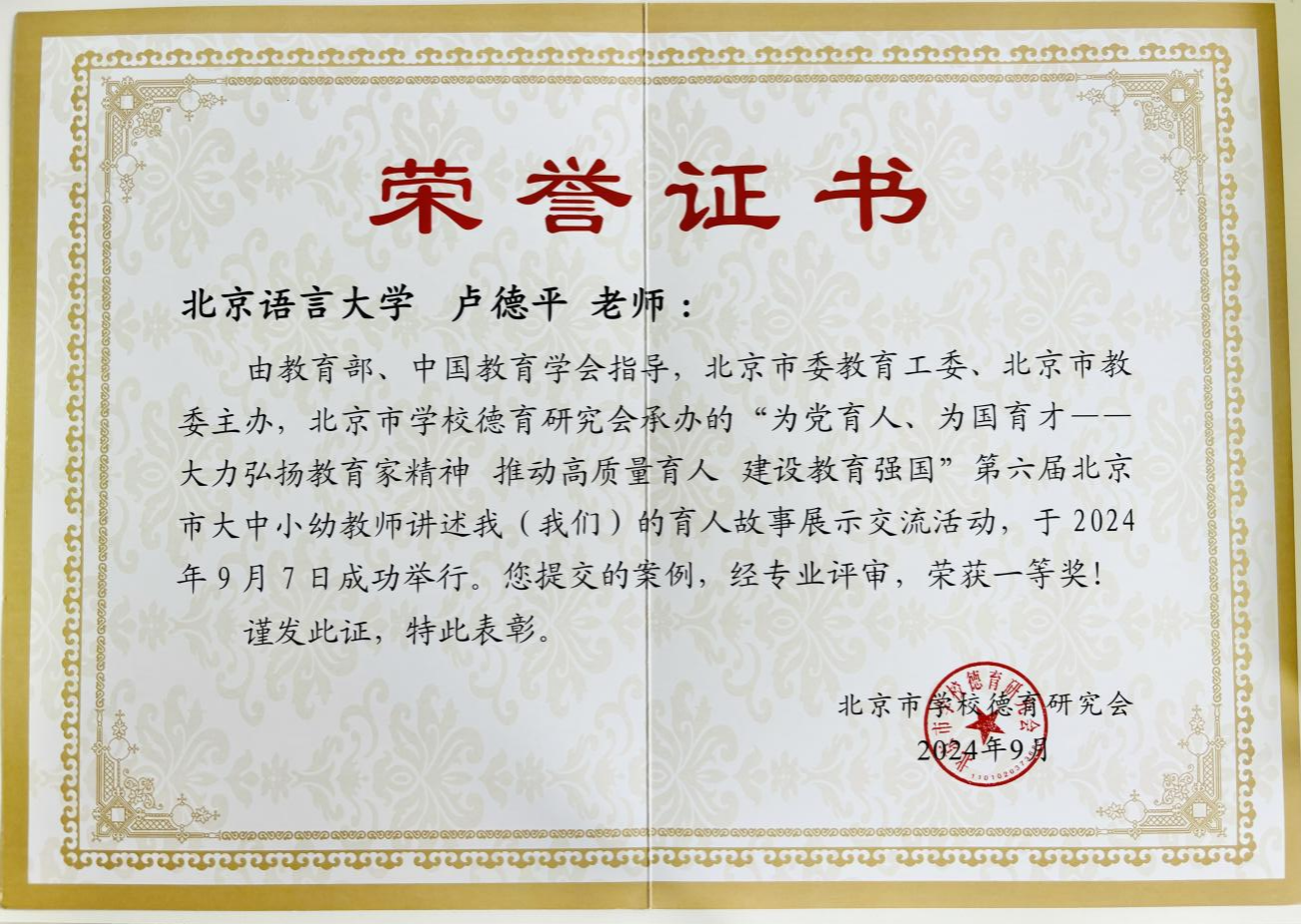 第40个教师节来临之际,由教育部、中国教育学会指导,北京市委教育工委、北京市教委主办,北京市学校德育研究会承办的“为党育人 为国育才——第六届北京市大中小幼教师讲述育人故事展示交流活动”举行。活动共收到530多份组织推荐的育人案例,经专业评审,我校教师教育学院杨玉玲教授和语言学系卢德平教授的育人故事均获一等奖。