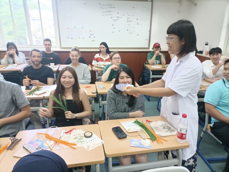 本次体验课共分为五个环节。在“以花入谜庆中秋”环节,北京语言大学医院中医科副主任医师张婷以“中秋节与中医药”为主题,为同学们讲解了中秋节与中医药的相关知识。其中,还专门介绍了具有治疗疾病和养生功效的多种花卉。组织方为每位同学准备了一把画有花卉的扇子,扇面上有一个关于花类药物的谜语,张大夫在带领同学们猜谜语的同时,给大家讲解了许多中药知识,同学们听得津津有味。