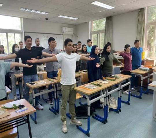 在“二十四节气之白露养生功法”环节,同学们和张大夫一起练习了中医养生功法,了解了二十四节气中白露节气的气候特点和养生方法。