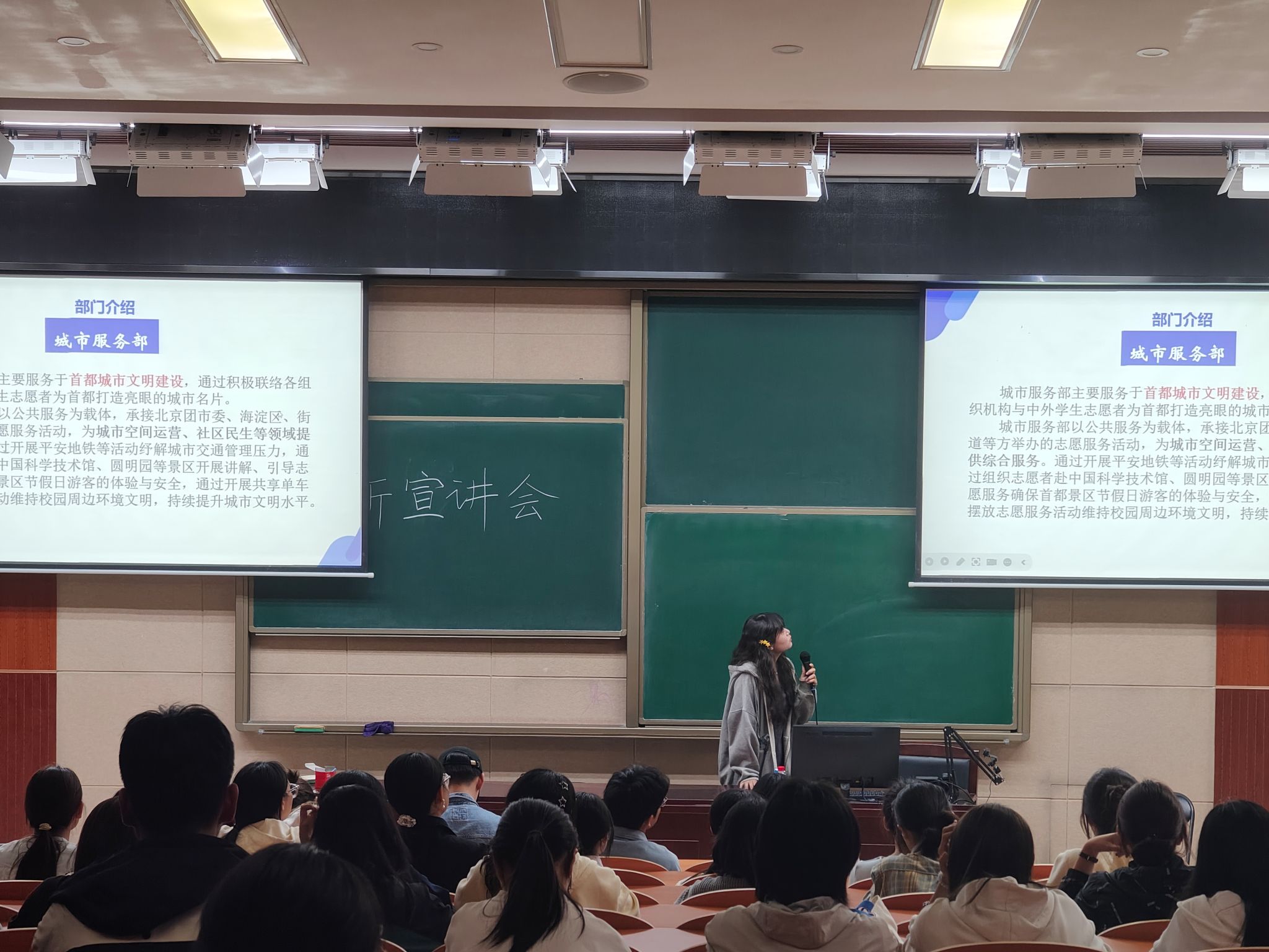 9月21日,北京语言大学志愿服务总队招新宣讲会在主南楼102顺利开展。宣讲会主要包括播放总队介绍视频、介绍各部门职能部署以及现场答疑等环节,各部门负责人依次发言,以冀全方位增进同学们对北语志愿服务总队的了解。在现场答疑环节,同学们展示出了高涨的热情,队长及各部长主任就新生提问为其一一解答。