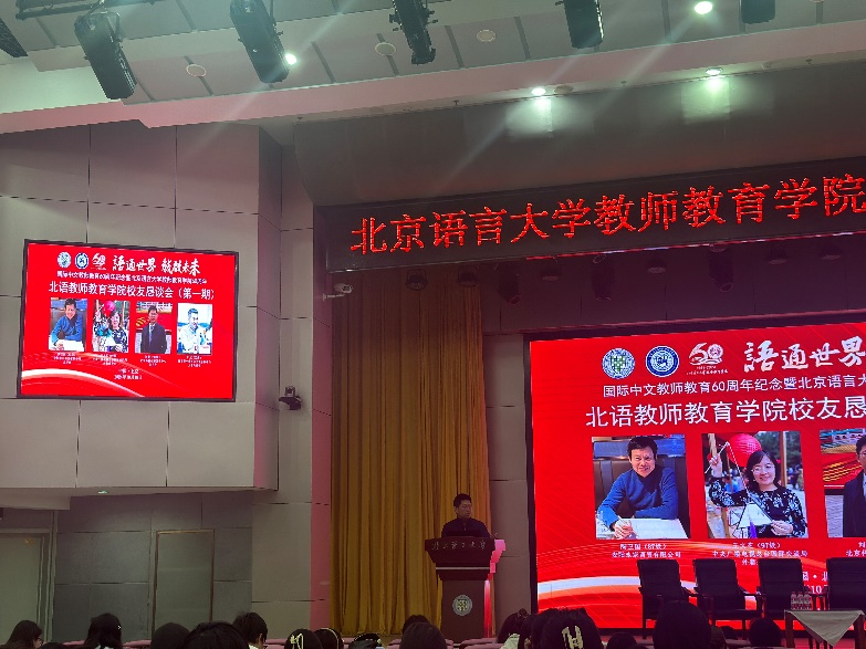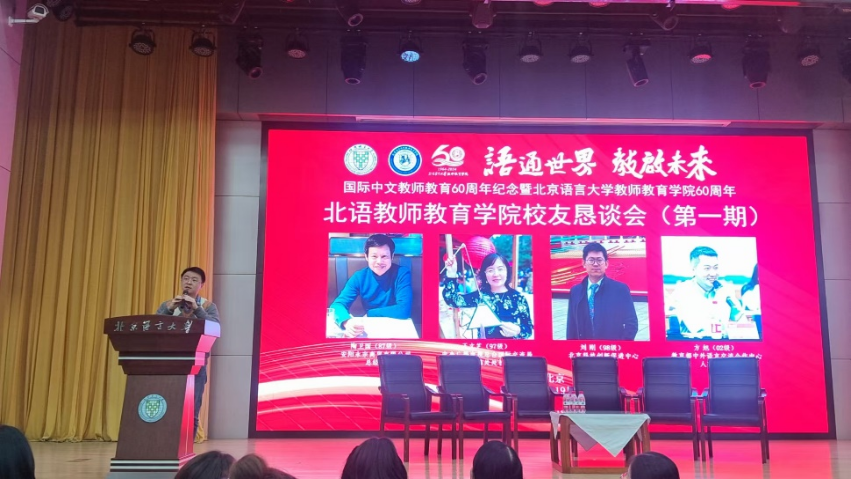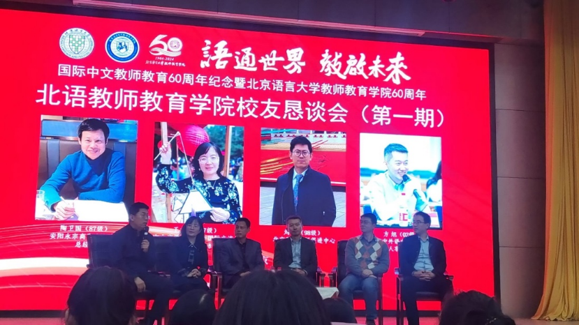 为庆祝国际中文教师教育60周年暨北京语言大学教师教育学院建院60周年,10月19日下午,北京语言大学教师教育学院在教一楼209报告厅举行首期校友恳谈会。出席本次恳谈会的校友代表有87级本科生校友陶卫国(现任安阳永宗商贸有限公司总经理)、97级校友王文芝(现任中央广播电视总台国际交流局外籍处处长)、98级校友刘刚(现任北京科技创新促进中心副主任)、98级校友胡钰旻(现任外交部美大司参赞)和02级校友方旭(现任教育部中外语言交流合作中心人事处处长)。教师教育学院院长施家炜教授,原党委书记程娟教授、党委书记王孝强、语言资源高精尖创新中心副主任刘晓海、汉语教育教研室主任郑家平,以及部分师生代表共100余人参加了会议。恳谈会由学院党委副书记、纪委书记李晓波主持。