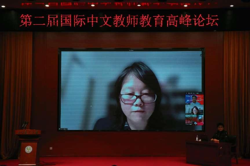 加拿大卡尔加里大学教授、汉语及日语研究部主任、北京语言大学教师教育学院海外兼职教授蔡薇的报告题目为《国际中文教育本土化教师的培养》,蔡薇教授认为培养本土化教师是全球中文教育可持续发展的关键因素,她聚焦海外(尤其是加拿大)的教育场景,探讨国际中文教育本土化教师的培养原则与可行路径,并提出了四项合作行动倡议,强调针对中文教师教育进行全球合作与经验共享的重要性。
