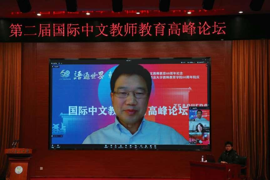 10月20日上午,第二届国际中文教师教育高峰论坛在北京语言大学逸夫报告厅顺利举办,该论坛是国际中文教师教育60周年纪念暨北京语言大学教师教育学院60周年院庆系列活动之一。北京语言大学教师教育学院院长施家炜教授主持论坛,美国加州大学戴维斯分校教授、世界汉语教学学会标准与认证工作委员会副主任委员储诚志和中央民族大学国际教育学院院长陈天序教授担任主旨报告的嘉宾主持,原北京语言大学离退休处处长袁丹、教师教育学院党委书记王孝强及多位校内外教师和校友出席论坛。论坛分上下两场,五位深耕国际中文教师教育领域的国内外专家做了精彩的主旨报告。