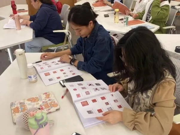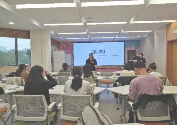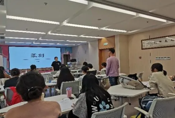 随后,董原老师和张晔老师为同学们简要讲述了篆刻的文化价值与内涵,让同学们对篆刻有初步的了解,通过作品展示带领学生们欣赏名家大作,并组织同学们描摹仿写篆字。同学们积极跟随老师的步伐,仔细聆听,认真学习篆刻知识。