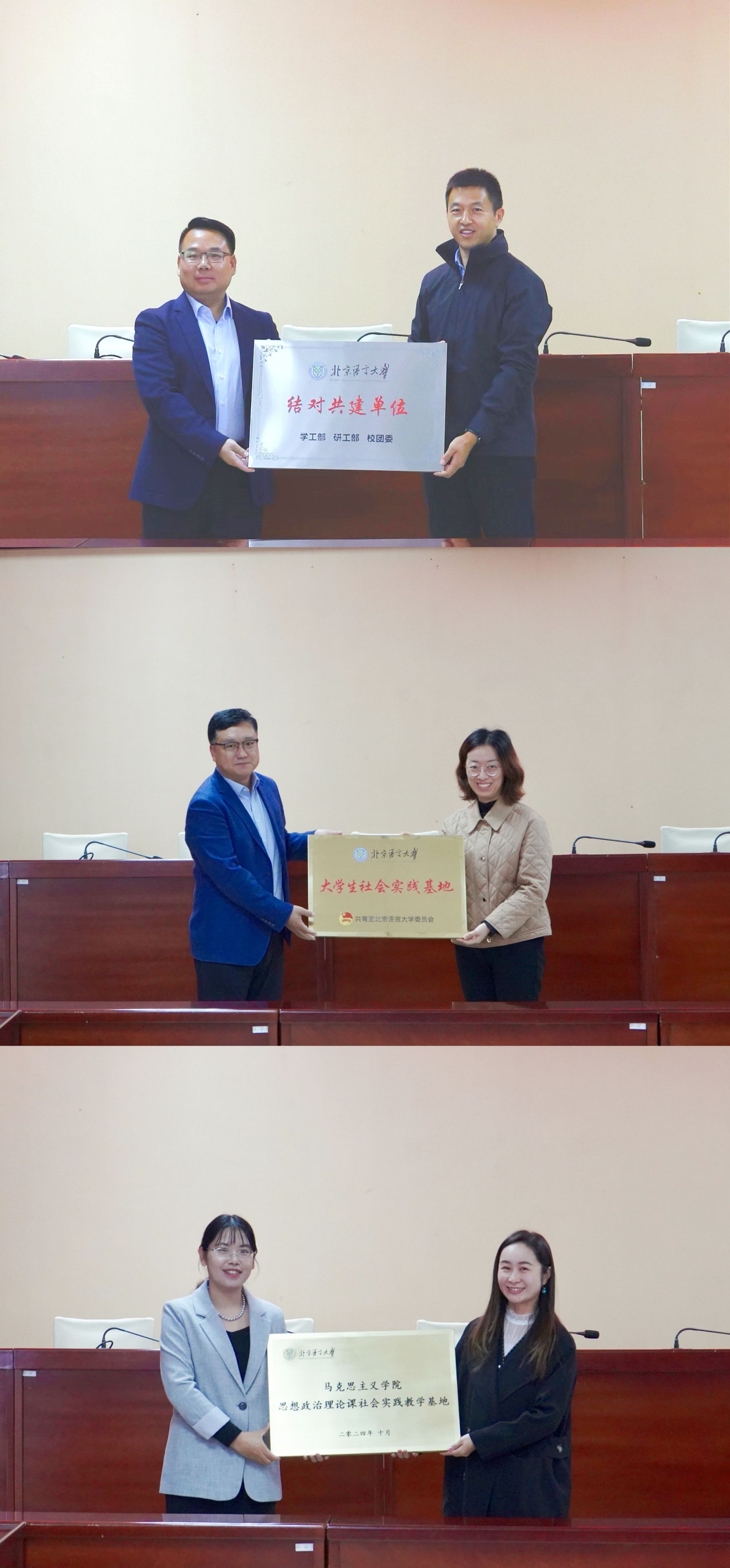 座谈会后,双方举行了“结对共建单位”“大学生社会实践基地”“思想政治理论课社会实践教学基地”授牌仪式。