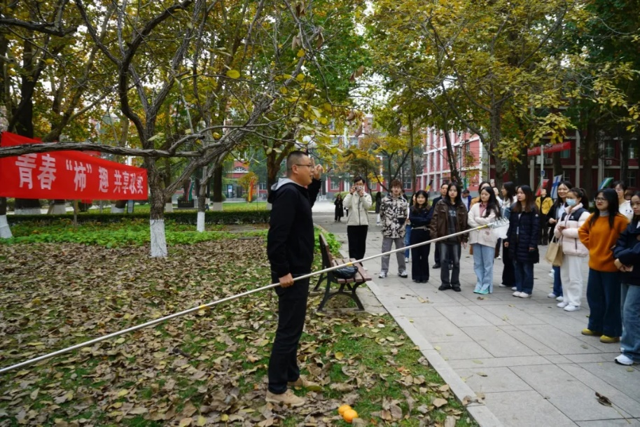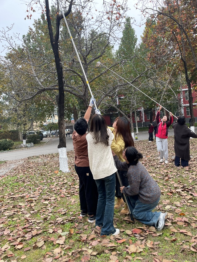 活动伊始,后勤老师详细讲解了采摘方法及安全注意事项,大家认真倾听。由于首次使用采摘工具,老师同学们遇到了不少挑战,但在后勤老师的耐心指导和团队齐心协力的合作下,大家逐渐掌握了工具的使用要领和采摘技巧,顺利摘下了又大又圆的柿子。师生们挥洒着汗水,在劳动中体会着付出与收获的喜悦,在欢声笑语中感受着党组织的温暖和凝聚力。采摘结束后,大家自发将柿子林的垃圾进行了清理,为校园增添了一份美好。