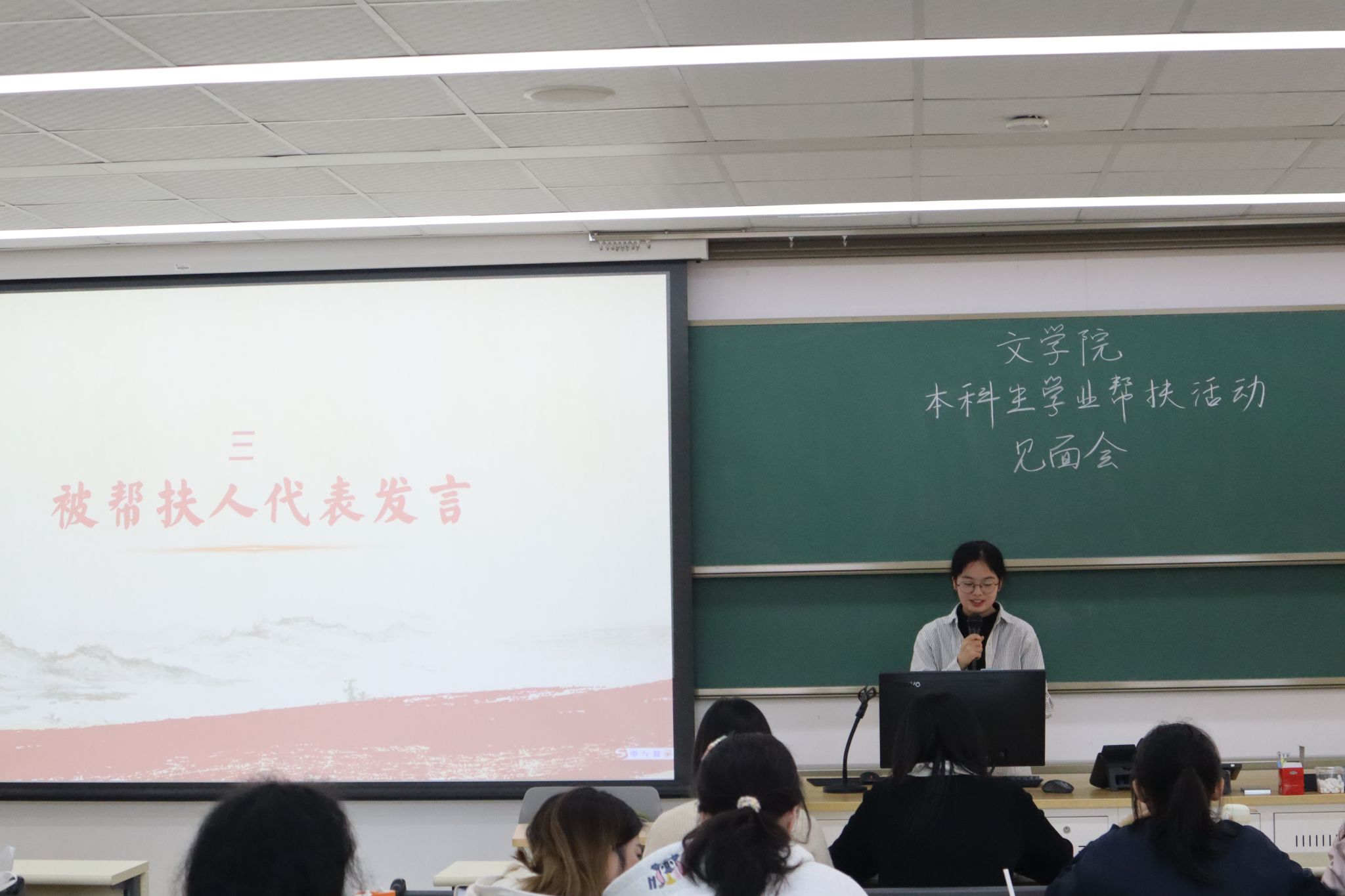 随后,被帮扶人代表程雪与学业帮扶人代表薛楠分别上台发言。程雪同学首先表达了对参与此次活动的热切期待。她希望能够通过活动更好地掌握学习方法。同时她也表示自己将保持严谨认真的学习态度,恪守活动纪律,在课前和学业帮扶人积极沟通,以便在帮扶活动中更有针对性地学习。学业帮扶人代表薛楠同学表示,正是因为曾经受到过学长学姐们的热心帮助,她深感有责任将文学院这一温暖的传统继续传递下去,帮助低年级同学解决学业上的困扰。她表示自己定当尽心竭力,全力以赴,用心完成本次学业帮扶活动的每一项任务。