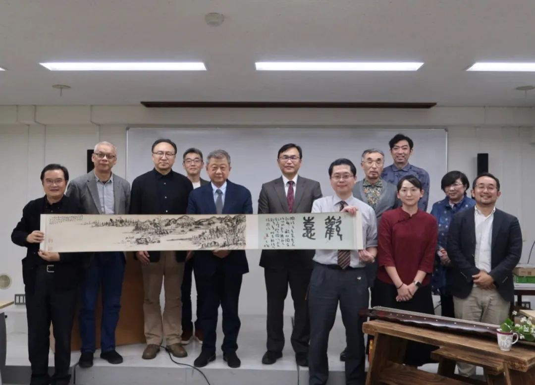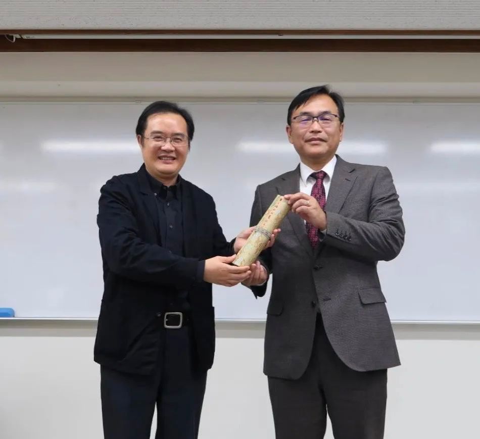 10月30日,东京大学东洋文化研究所举办“文人与艺术” UIA研讨会,朱天曙教授应邀出席,并作主题演讲。活动结束后,朱天曙教授将《渴笔书画卷》无偿捐赠给东京大学东洋文化研究所收藏,该研究所所长中岛隆博教授代表校方接受了朱天曙教授捐赠的手卷作品。