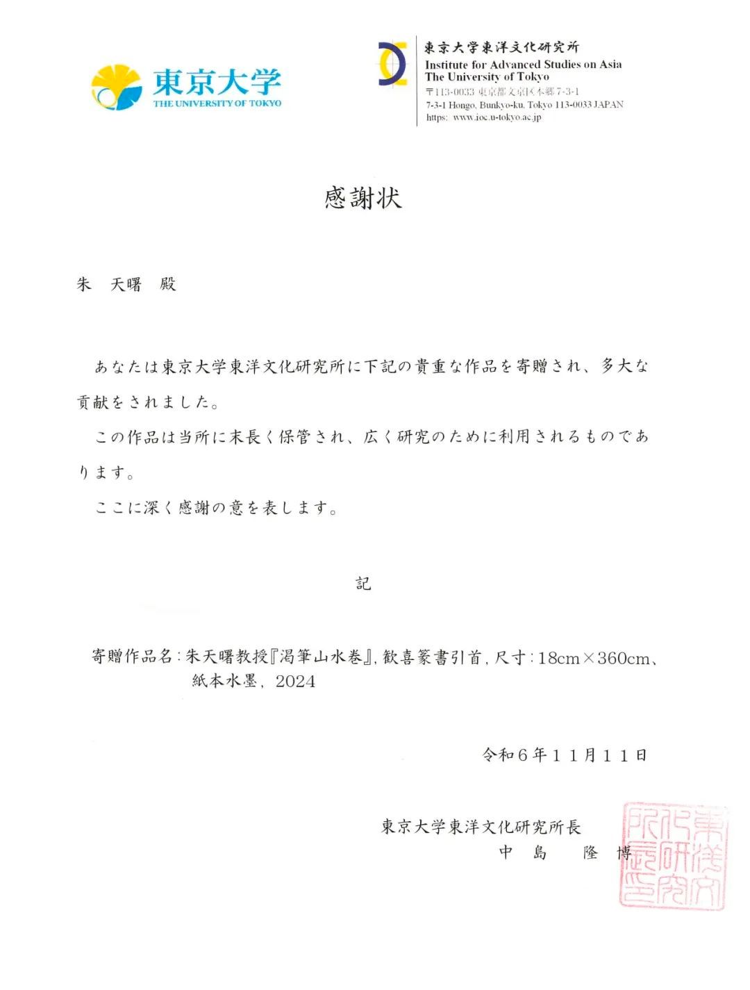 东京大学东洋文化研究所颁发的感谢状指出,朱天曙阁下向东京大学东洋文化研究所捐赠了珍贵艺术作品,为中日文化交流做出了重要贡献。该作品将长期保存东京大学,并广泛用于中日艺术和学术上的研究。
