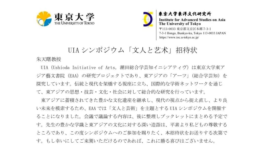 东京大学UIA(Ushioda Initiative of Arts 潮田综合学艺知识计划)是东京大学东洋文化研究所、教养部联合组建东亚艺文书院(EAA)的研究项目,意在探究东亚作为综合学艺的知识,立足于沟通传统与现代,通过国际学术交流,对东亚的思想、艺术、文化与社会展开综合研究。朱天曙教授参与此项中日艺术交流,将对中日艺术和文化交流产生积极影响。