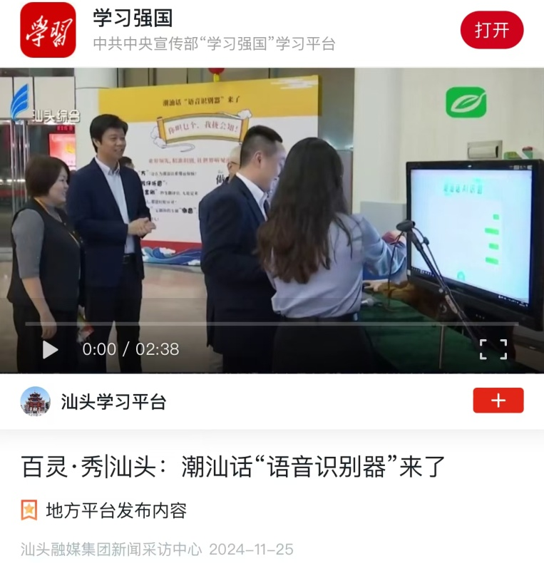 在同期举行的第二十二届国际潮团联谊年会和第十届世界潮商大会上,一款潮汕话的“语音识别神器”在汕头广播电视中心亮相,该系统能将潮汕方言准确识别,并实时用语音生成文字,是业内首个同时支持潮汕方言直译和意译的语音识别平台。该项目融合了前沿的人工智能技术,针对潮汕方言的复杂语音特征进行计算,实现对潮汕方言的高准确度识别,并适用于多种场景,为媒体内容制作、教育学习、智能驾驶、智能客服、实时字幕与翻译等提供便捷的智能语音交互体验,主要应用在车载系统、实时字幕与翻译、潮汕智能助手、潮汕文化教育平台、医疗辅助平台、智能家居控制平台六大方面。该智能语音识别系统的研发由深圳广电组织发起,北京语言大学等五家单位的研究团队合作打造。