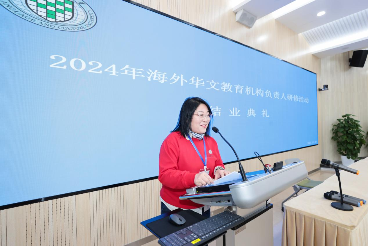 11月29日,2024年海外华文机构负责人研修活动结业典礼在北语教二楼101会议室举行。市侨办二级巡视员马东、侨务事务处处长林婕、北京语言大学应用中文学院院长、中华文化国际传播中心主任苏英霞、应用中文学院院务委员会主任周鑫等领导嘉宾出席,全体学员参加了结业典礼。典礼由北京语言大学党外知识分子联谊会常务副会长吕静主持。