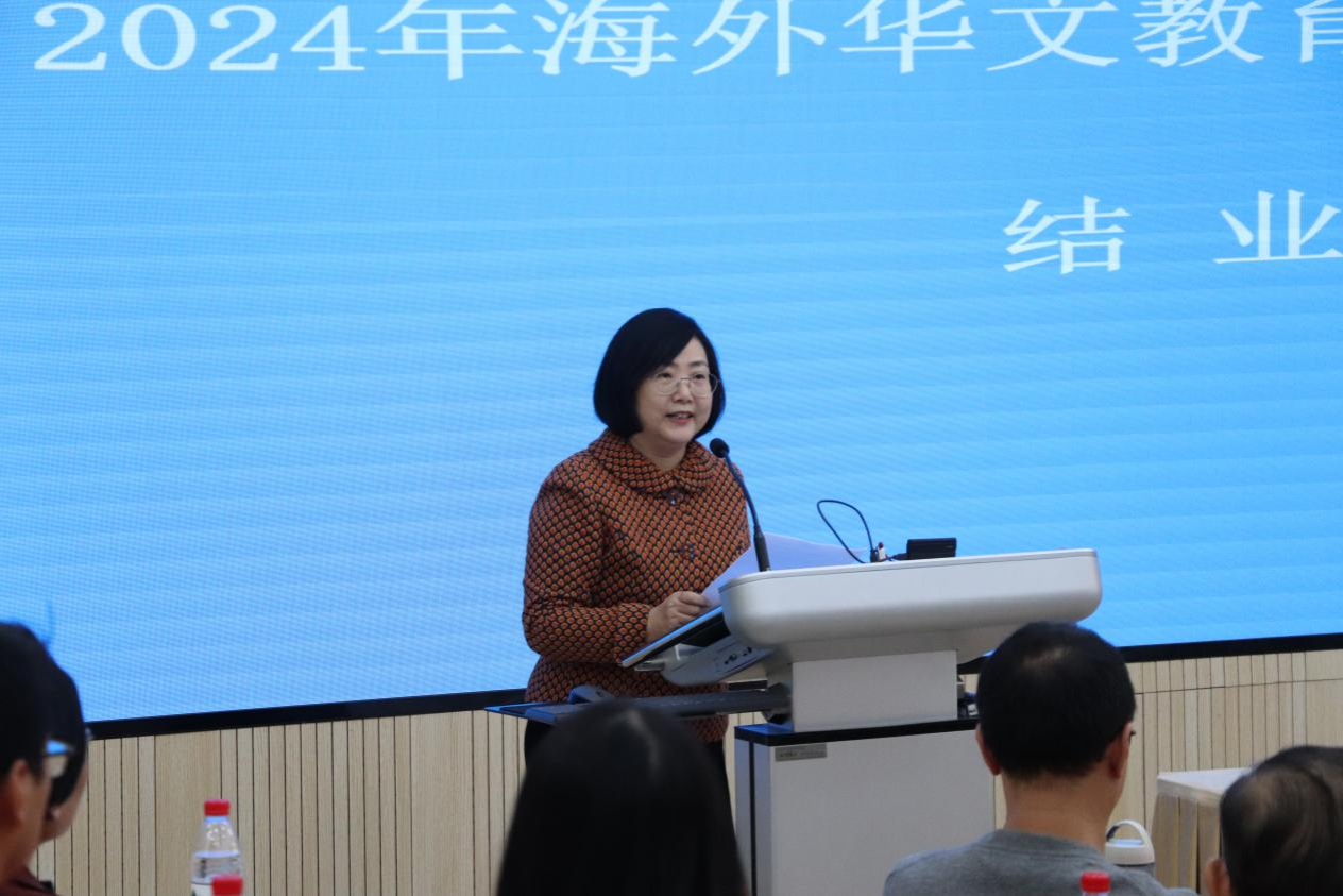 韩国光州中国学校副会长武君芳作为学员代表发言。她表示,此次研修活动是一场充实而深刻的学习之旅,课程内容丰富多彩,活动形式多样,涉及中国文化、国情、教育等多个方面,不仅学到了知识,更收获了成长与感动。期待未来能与大家继续携手,共同为海外华文教育事业贡献智慧和力量,成为中华文化的传播者、世界交流的使者,共同开创华文教育的美好明天。