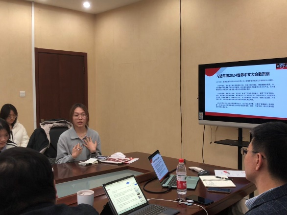 研究生支部组织委员苏晗瑜表示,通过学习贺信精神增强了汉教人的使命感,作为汉语国际教育专业的学生,她将学以致用,创新汉语教学方法,积极参与国际交流合作,以汉语为桥梁努力弘扬中华优秀传统文化。