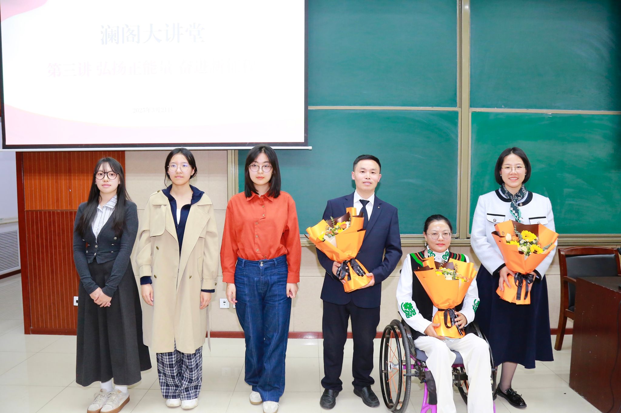 三位主讲人的精彩讲述鼓舞了现场的每一位同学,同学们也表达了对他们的敬佩之情。交流环节中,三位主讲人细致地回答了同学们的问题,鼓励同学们要勇敢地面对生活中遇到的困难,常怀一颗感恩、善良之心去体验生活、感受生命的力量,自强不息、锐意进取,脚踏实地走出属于自己的光明坦途。讲座最后,学生代表为三位主讲人献上鲜花,表达敬意。