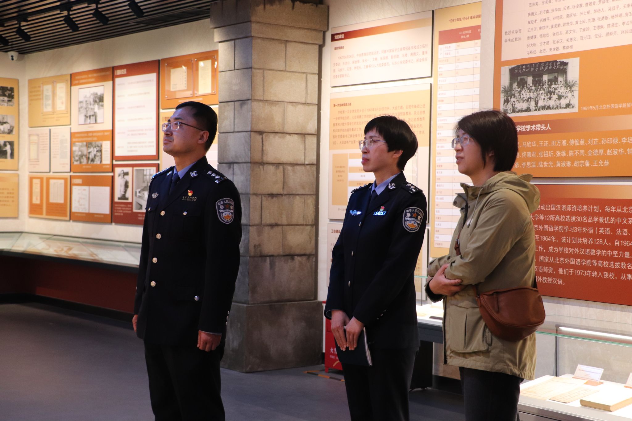 来访活动伊始,边防检查总站民警一行11人与北语师生代表共同参观了校史馆。通过珍贵的历史影像和实物展品,来访嘉宾深入了解了北语“德行言语,敦睦天下”的校训精神以及学校在语言教育与国际化人才培养领域的突出成就,为后续交流奠定了良好基础。
