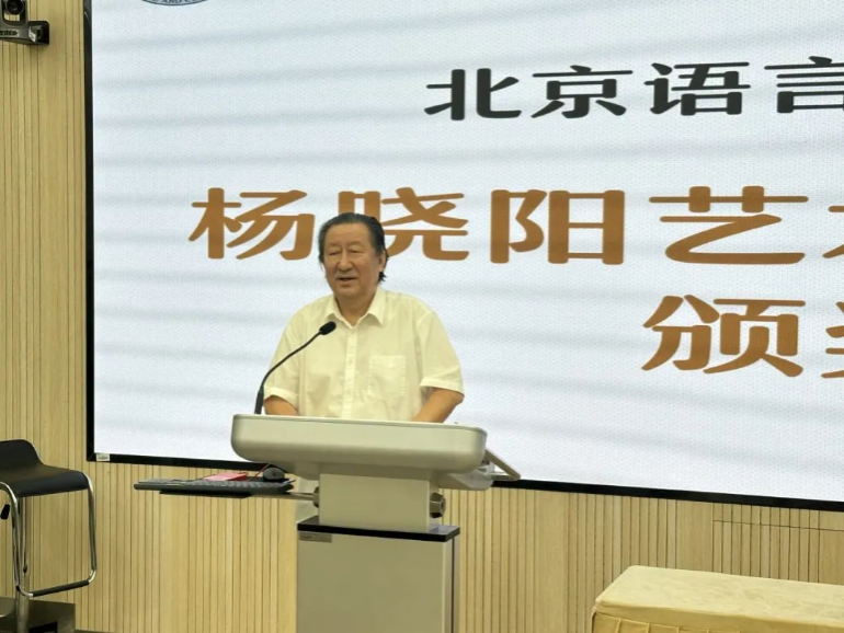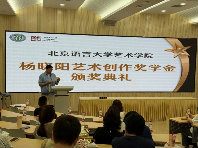 艺术学院副院长宋凯主持仪式并介绍北京语言大学艺术学院“杨晓阳艺术创作奖学金”的设立背景和评选过程。杨晓阳先生于2020年-2025年初受聘担任北京语言大学艺术学院名誉院长,在此期间,他始终致力于推动学院事业发展和扶持师生艺术创作,此次从自己的名誉院长酬金专项经费中拨出资金专门设立“杨晓阳艺术创作奖学金”,旨在鼓励和扶持青年学子进行艺术创作和探索。这体现了杨晓阳先生对艺术教育事业的无私奉献,对青年艺术学子成长的深切关爱和他传承文化薪火的坚定信念与博大情怀。评奖过程中,杨晓阳先生亲自领衔校内外专家团队,从50多件作品中进行严格遴选和评定,确保奖项的公正性和专业性。