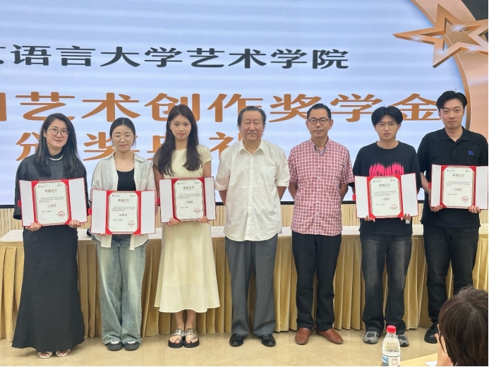 在颁奖环节,杨晓阳先生一一为获奖青年学生颁发获奖证书并合影留念,随后发表了语重心长的讲话。他对获奖同学表示热烈祝贺,勉励同学们在漫长的艺术道路上用不懈的坚持和努力走好每一步。只有稳扎稳打,坚持不懈,艺术之路才能越走越宽。他对北京语言大学艺术学院近年来的发展表示肯定,他说,在北京语言大学这所独具特色、不可替代的高校中,艺术学院基础扎实、教学严谨、特色鲜明,随着师资队伍的壮大和艺术学科的发展,未来一定会创造出更多、更好的成绩。