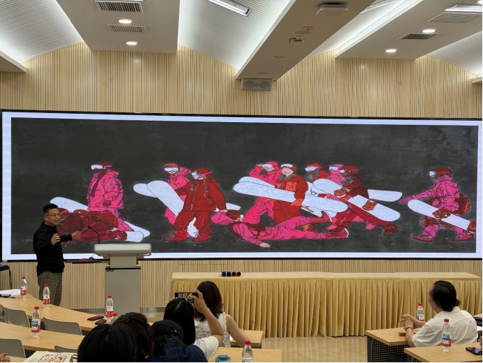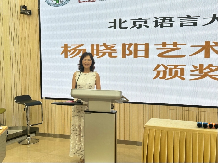 艺术学院院长陈霞发表热情洋溢的讲话。她衷心祝贺获奖同学,并对杨晓阳先生致以崇高的敬意,感谢他以艺术大家的视野和情怀设立这个奖学金,为青年学子点亮艺术前行的灯塔,为兄弟院校搭建起促进交流的平台。她表示,北京语言大学艺术学院始终致力于培养具有中国灵魂、世界眼光、人文情怀、创新能力的复合型艺术人才,鼓励同学们既扎根中国文化传统,也拥抱世界多元文化,杨晓阳艺术创作奖学金的设立,正是对这一育人理念的有力呼应和加持,必将推动艺术人才的成长和艺术生态的繁荣。同时陈霞院长也对青年学子提出几点希望,叮嘱大家珍惜荣誉、砥砺前行;深植传统、拥抱创新,像杨晓阳先生经常说的,“一手伸向传统,一手伸向生活”进行创作,做有温度有筋骨有道德的艺术家;还要融通中外,用艺术讲好中国故事,做文明交流互鉴的艺术使者。