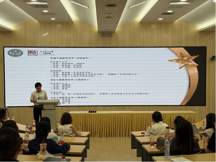 艺术学院党总支副书记(主持工作)张雯强宣布获奖名单。获奖作品分绘画、书法、音乐三个专业类别,分别设一、二、三奖,共18名校内外学生的作品获奖,获奖者来自北京语言大学艺术学院和中央美术学院、中国艺术研究院、中央民族大学、北京师范大学、首都师范大学、上海大学等院校。艺术学院党总支副书记史大鹏通过大屏幕为现场师生展示获奖作品。