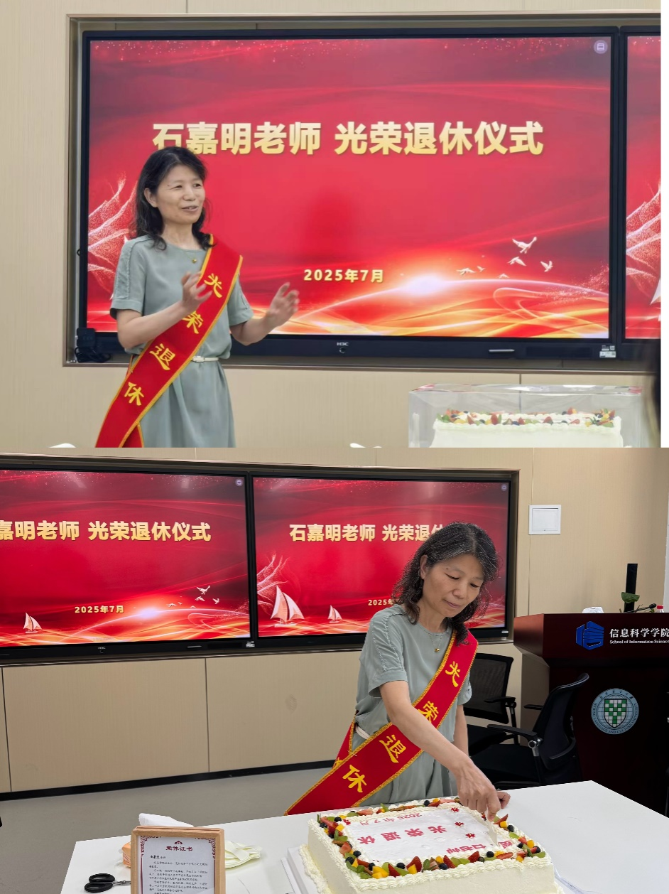 大会尾声,温馨而庄重的荣休仪式如期举行,向本学期退休的石嘉明老师致敬。作为信息科学学院的元老,石嘉明老师自学院成立之初便在此任教深耕,是学院当之无愧的奠基者。二十余载春秋流转,她见证了学院从初创到发展壮大的每一步历程,她以严谨的治学态度和深厚的育人情怀,为学院的发展倾注了大量心血,亲手塑造并奠定了学院淳厚质朴的师德师风与严谨求实的院风学脉。仪式现场,党委教师工作部领导、历任院领导、退休老同事与青年教师代表分别发言。