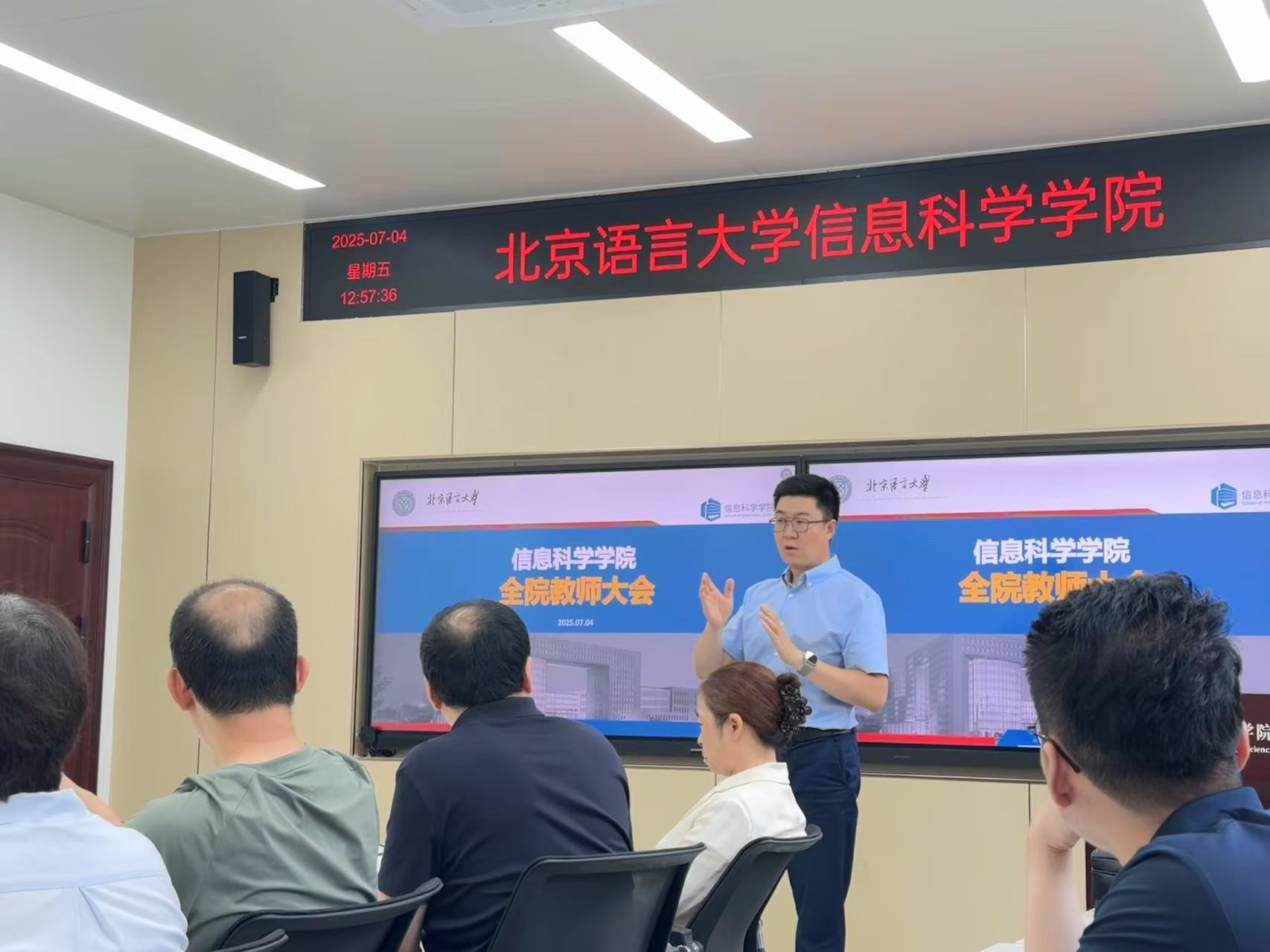 北语新闻网7月14日电(通讯员 陈曲 陆瑶 摄影 陈曲 赵子然)7月4日,信息科学学院在主楼南304会议室召开2025年春季学期期末全院大会暨石嘉明老师荣休仪式。党委教师工作部部长、教师发展中心主任展明锋应邀出席,学院党委书记李超主持会议。