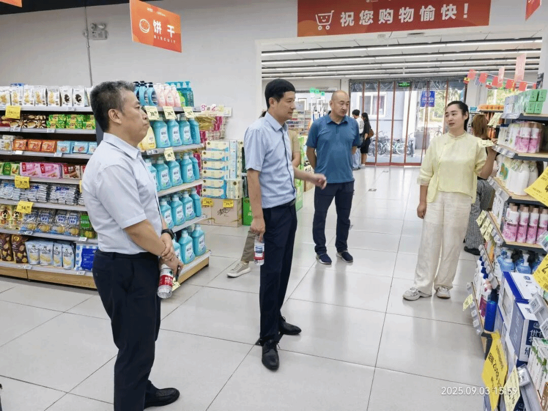在清晏楼和物美超市,他检查了食堂和超市的物资储备情况,强调要把食品安全放在首位,细化食品安全管理细节,确保商品质量、合理定价,根据学生返校情况准备餐食。