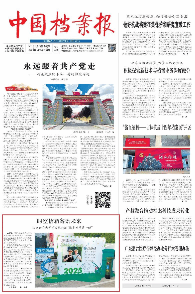 北语新闻网9月29日电(通讯员 彭伟淳 摄影 何苗 王乐怡)在中国人民抗日战争暨世界反法西斯战争胜利80周年之际,校史馆围绕“知史荣校爱校,传承奋进担当”主题,在新学期面向2025级全体新生开展了多项融合校史文化与红色基因的教育活动,激发学生的爱国情怀与爱校意识,多方位打造“校史开学第一课”。相关工作成效显著,获《中国档案报》2025年9月26日头版专题报道。