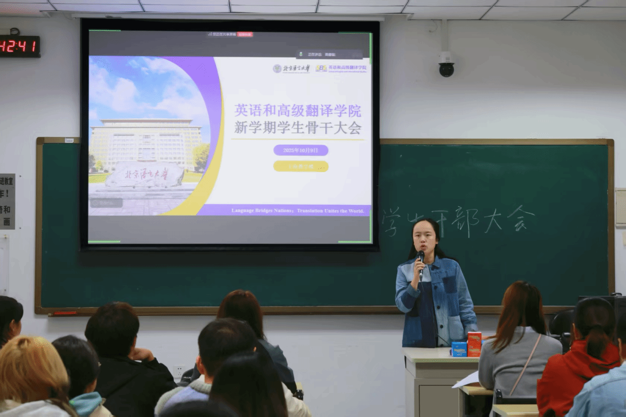 北语新闻网10月13日电(通讯员 朱沁桐 摄影 王晶银)10月9日中午12:40,英语和高级翻译学院新学期学生干部大会在主楼南顺利举行。学院党委副书记刘洁老师、学办主任、分团委书记高睿璇老师、教务办公室负责人陈泽丛老师、本科生辅导员盛伊琳老师、苌怡萍老师、兼职辅导员王赐骏老师、团总支副书记洪祺玥及各班学生干部代表出席本次会议。高睿璇老师主持本次会议。