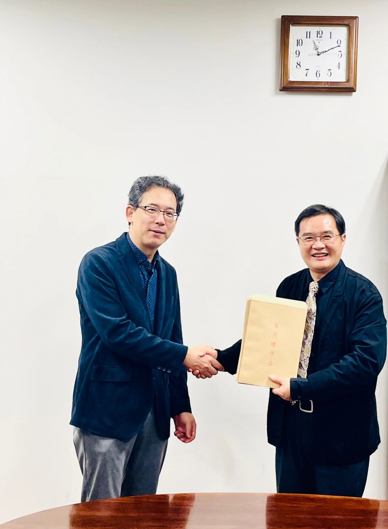 在表彰仪式上,京都大学人文科学研究所所长森木淳生教授对朱天曙教授精心创作书画精品入藏人文研表示感谢。他说,朱天曙教授是著名的书法篆刻家和中国艺术史学者,在中日有着重要的影响。近年来,作为京都大学人文科学研究所共同研究员,参与近代中日哲学与文化艺术的研讨,成果丰硕。京都大学人文研将迎来百年诞辰,首次收藏当代书家作品,朱天曙教授的艺术史研究成果和艺术作品将丰富本研究所的珍藏。朱天曙教授致答谢辞,他说,京都大学人文科学研究所近百年来,在历史、哲学、文学、艺术等方面有重要成果,出现了很多享誉世界的人文学者。感谢人文研多年来的关心和支持,希望能和京大进一步合作,推动中日艺术史研究和艺术创作走向深入。朱天曙教授还向人文研图书馆赠送了《中国书画》2024年第5期刊有京都大学人文研书法史研究专访的杂志。