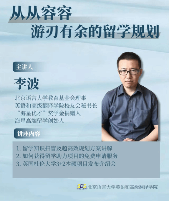 李波,北京语言大学教育基金会理事,英语和高级翻译学院校友会秘书长,“海星优才”奖学金捐赠人,海星高端留学创始人。