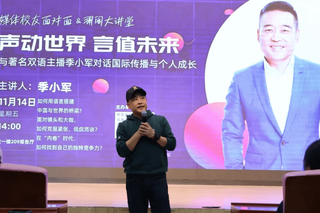 北语新闻网11月21日电通讯员 严丹 薛冰延 摄影 范徐一真 郑依楠)11月14日下午,我校90级英语专业校友、原中央广播电视总台著名双语主播季小军应邀重返母校,在教一楼209报告厅作了题为“声动世界·言值未来”的专题分享。本场讲座作为媒体校友面对面及澜阁大讲堂的重要活动,由校友会秘书处、宣传部、学生工作部、英语和高级翻译学院等多部门联合主办,季小军校友就国际传播与个人成长与在场师生进行了深度交流。