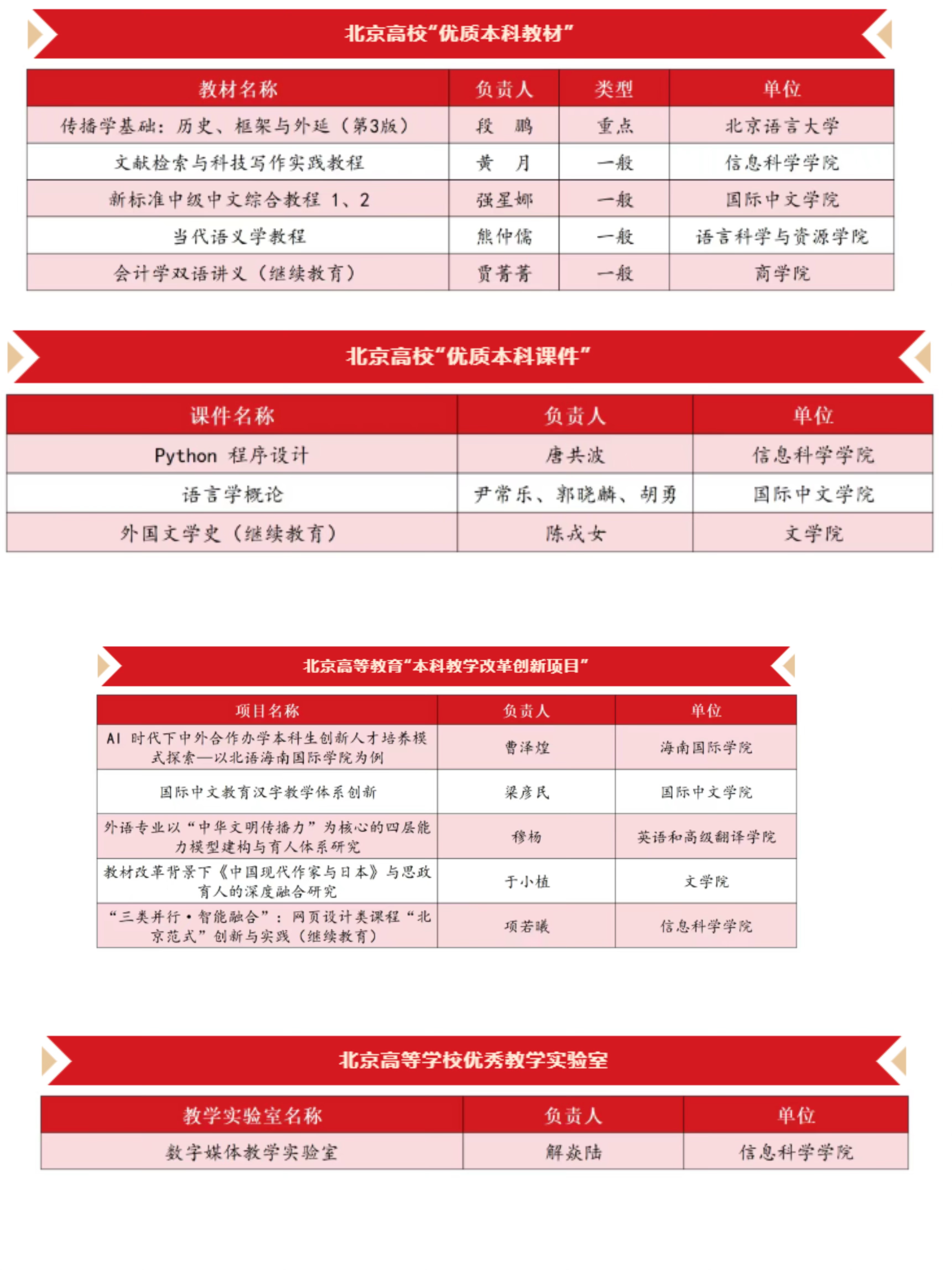 北语新闻网4月13日电(通讯员 陆瑶 摄影 苟丽丽 等)近日,北京市教育委员会公布2025年北京高校本科教学项目建设获评结果,我校共计28项教学项目成功入选。信息科学学院解焱陆、黄月、项若曦、唐共波四位教师分别凭借优秀教学项目成果荣誉登榜,充分展现了学院教师队伍扎实过硬的专业素养。