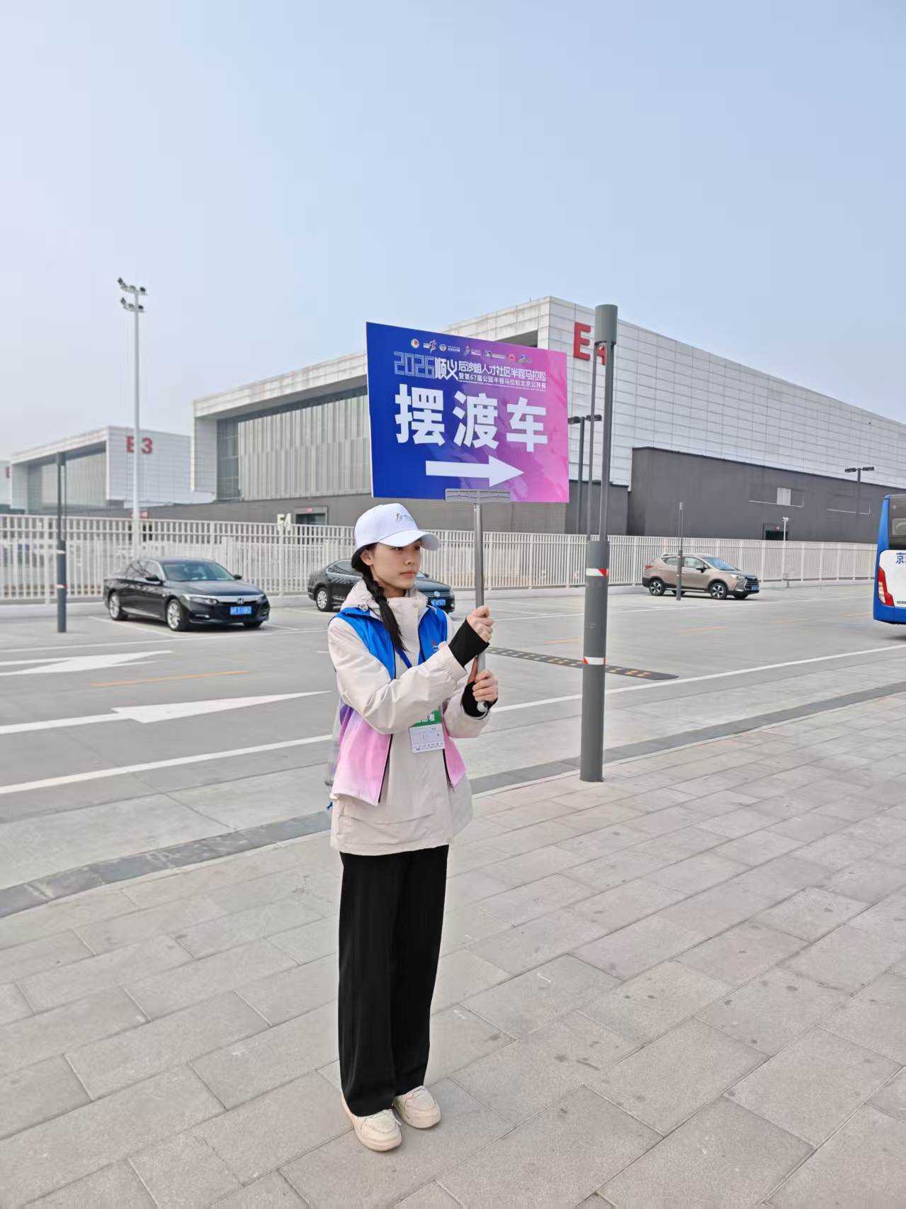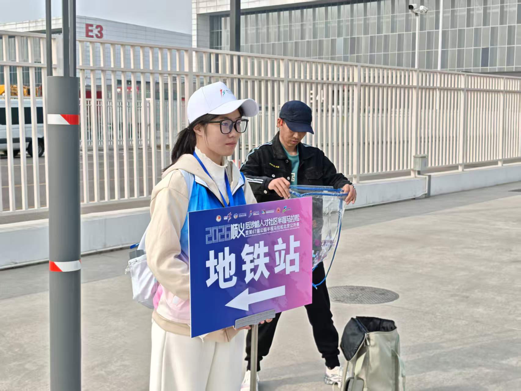 比赛前夕,首批6名展商区志愿者即从学校东门出发,提前抵达现场投入工作,他们不仅负责解答咨询、发放物资、维持秩序,还承担了主舞台节目催场与流程衔接等任务,为赛事启动做好了周全准备。比赛日当天凌晨,包括他们在内的18名志愿者(6名展商志愿者与12名双语志愿者)在梧桐会堂集结完毕,共同奔赴赛场。展商志愿者在赛中坚守岗位,赛后更主动承担了物资搬运与场地整理工作,保障了赛事圆满收尾。而本次服务最具北语特色的亮点,无疑是12名双语志愿者的表现——他们被部署在摆渡车接驳点及周边交通要道,以流利的中英双语,耐心引导完赛选手前往乘车点、清晰说明交通安排、指引地铁路线与共享单车停放点,为来自世界各地的参赛者提供了高效、准确的离场引导,有效保障了人员的安全、有序疏散,赢得了广泛赞誉。