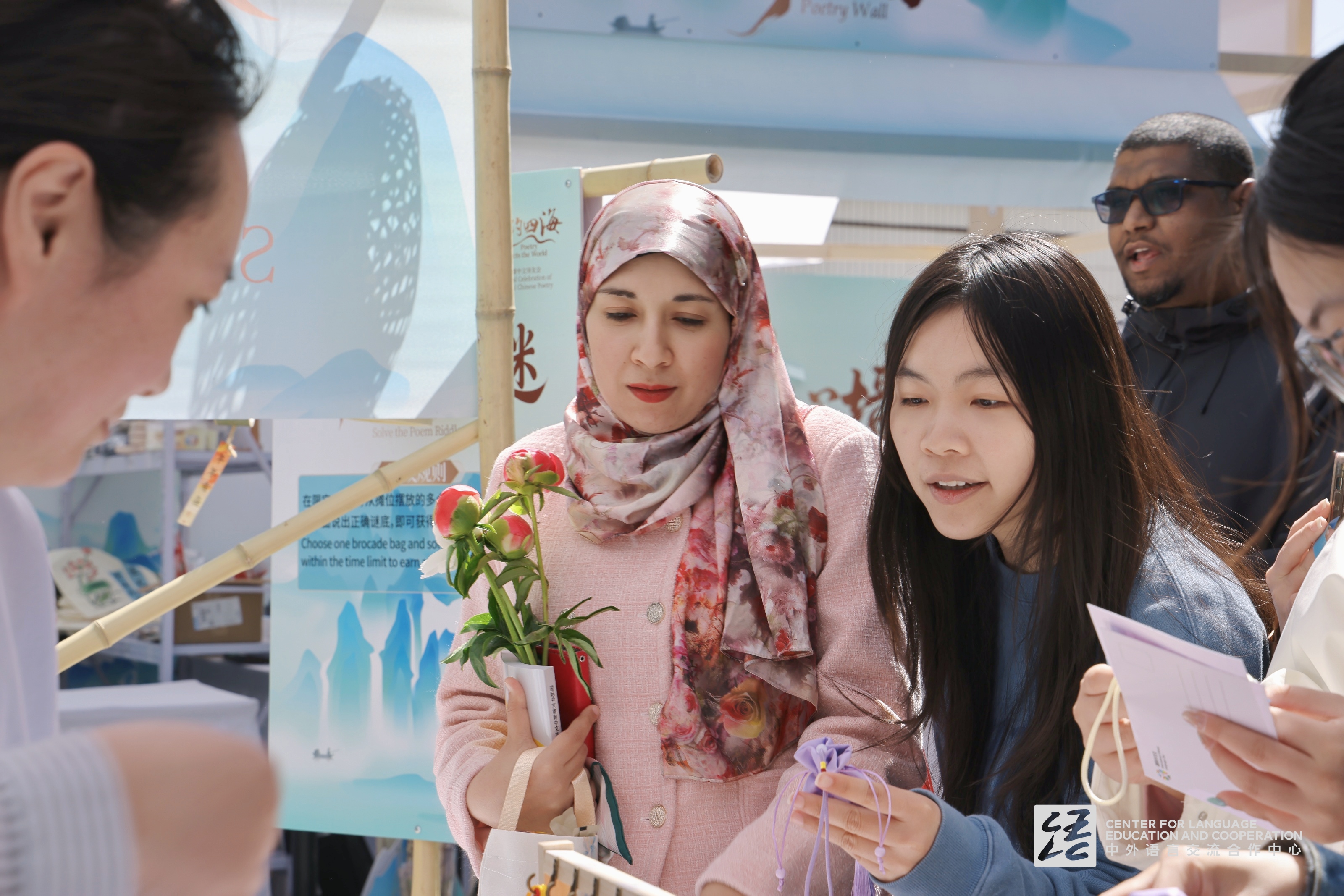 本次活动以“中文:点亮多彩梦想”为主题,内容丰富、形式新颖,兼具传统文化底蕴与前沿科技活力。启动仪式后,同学们走进“诗友阛阓”,参与诗词闯关、趣味打卡等互动游戏,在轻松氛围中领略中华诗词的韵律之美。系列展览现场,学子们体验AI中文教学工具、与数字人语伴互动,感受科技与中文教育的创新融合;同时驻足观赏牡丹文化、参与中医药非遗体验,通过穿汉服、制香囊等方式,近距离感受中华优秀传统文化。