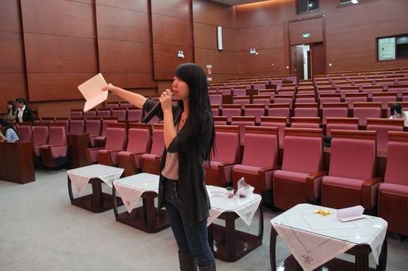 在彩排开始前进行了选手出场号码的抽签。进入19:00,当一切准备就绪后,第一次彩排正式开始。在主持人简短的开场白之后,选手依次模拟了决赛场上的第一个环节“自我介绍”和“半命题演讲”的走场,选手们和主持人在一起第一次相互配合难免有点紧张。学生会主席田媛在台下认真负责审批,选手一次又一次的走台,她一次又一次地为选手和主持人讲解环节的流程以及注意事项,并纠正选手和主持人不到位或者不合适的细节。第一个环节后神秘客串嘉宾带来一首动人英文歌曲的吉他弹唱。接着稍作商讨和休息,又重头开始进行第二次的彩排。当彩排最后一个环节结束后,十位选手一起上台排练了英文合唱《I believe I can fly》,虽然部分选手手里还拿着歌词,有的在台上声音还颤抖,但是从他们的总体表现来看还是可圈可点,相信不管明天结果如何,每位选手都能享受这个让梦成真的过程。因为"whether you fail or fly, at least you tried"。彩排的末尾,还模拟了最激动人心的颁奖仪式。
