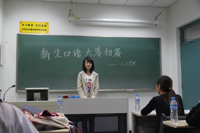 10月8日晚,人文学院2012级新生口语大赛初赛在主楼203、204教室展开,其中204作为选手候场室,比赛是在教室203进行。本次比赛,每位选手首先要进行60秒的自我介绍,然后按照现场抽取的主题做即兴演说,准备时间只有30秒。本次比赛的评委主要来自10级和11级的英语成绩优秀的同学。