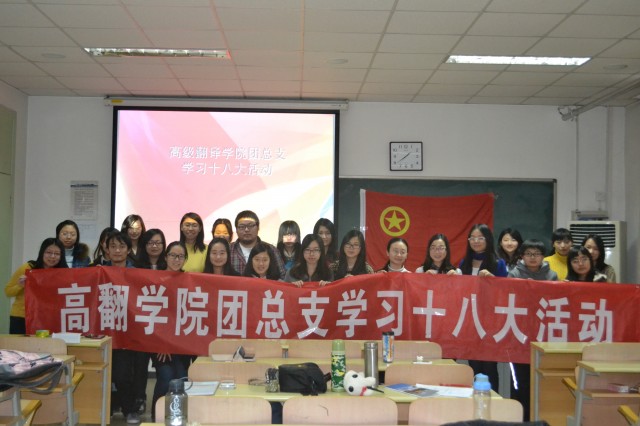 为贯彻学习十八大精神,响应校团委的要求,2012年12月11日中午12点50分,高级翻译学院团总支在教二楼408教室召开了“学习十八大”主题活动报告会。团总支书记王丽媛参加了此次活动。活动由团总支副书记田梦主持。