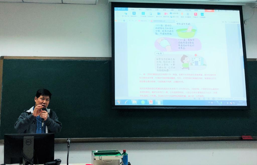 “烫伤怎么处理?”“运动伤分哪几种?”“急救的原则是什么?”“受伤之后还要继续参赛吗?”陈瑞和老师以他专业的知识、丰富的经历以及风趣的语言为大家进行了讲解;而在座的各位同学也认真听讲并踊跃提问,现场气氛活跃。